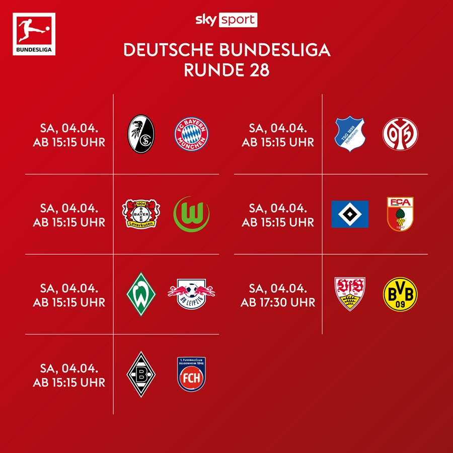 Außerdem zeigt Sky Sport den Bundesliga-Samstag inklusive der Topspiele der Woche sowie die Freitagabendspiele live.