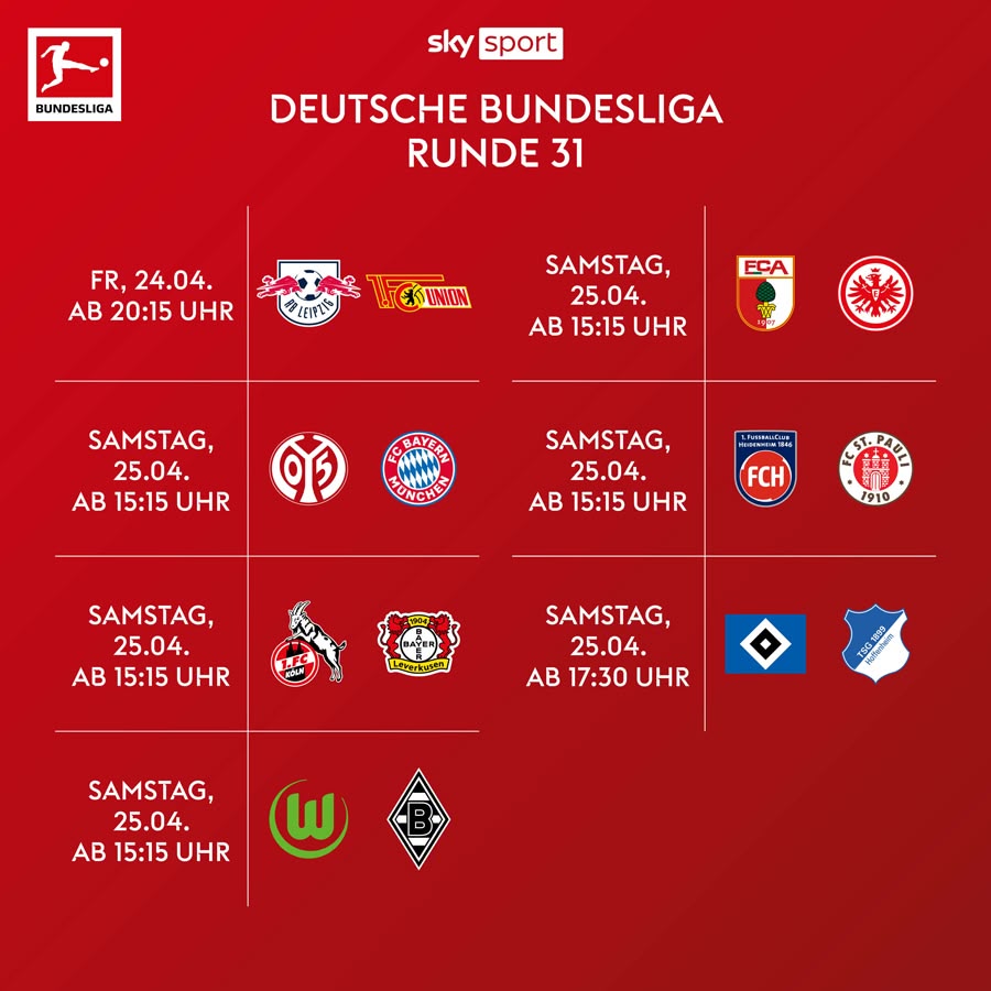 Außerdem zeigt Sky Sport den Bundesliga-Samstag inklusive der Topspiele der Woche sowie die Freitagabendspiele live.