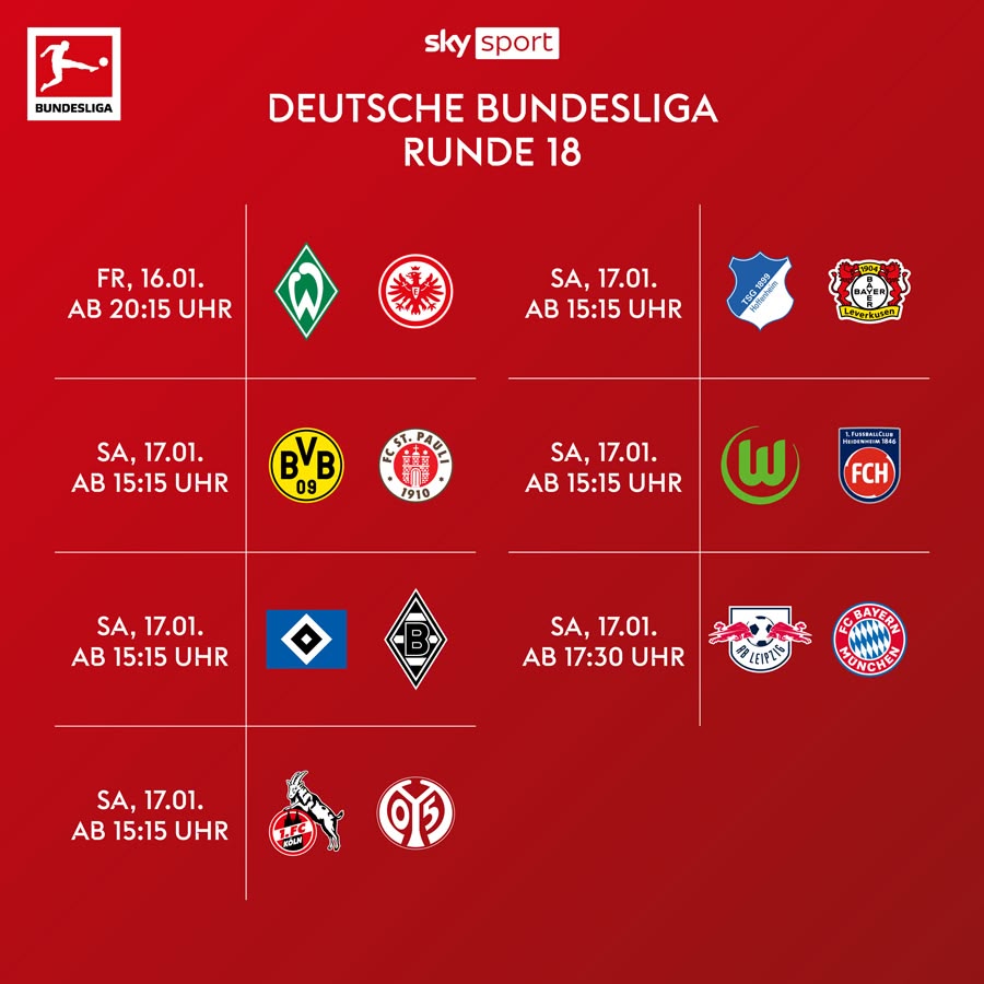 - Deutsche Bundesliga live über das komplette Wochenende: sieben der neun festen Anstoßzeiten, darunter der Freitagabend der Bundesliga