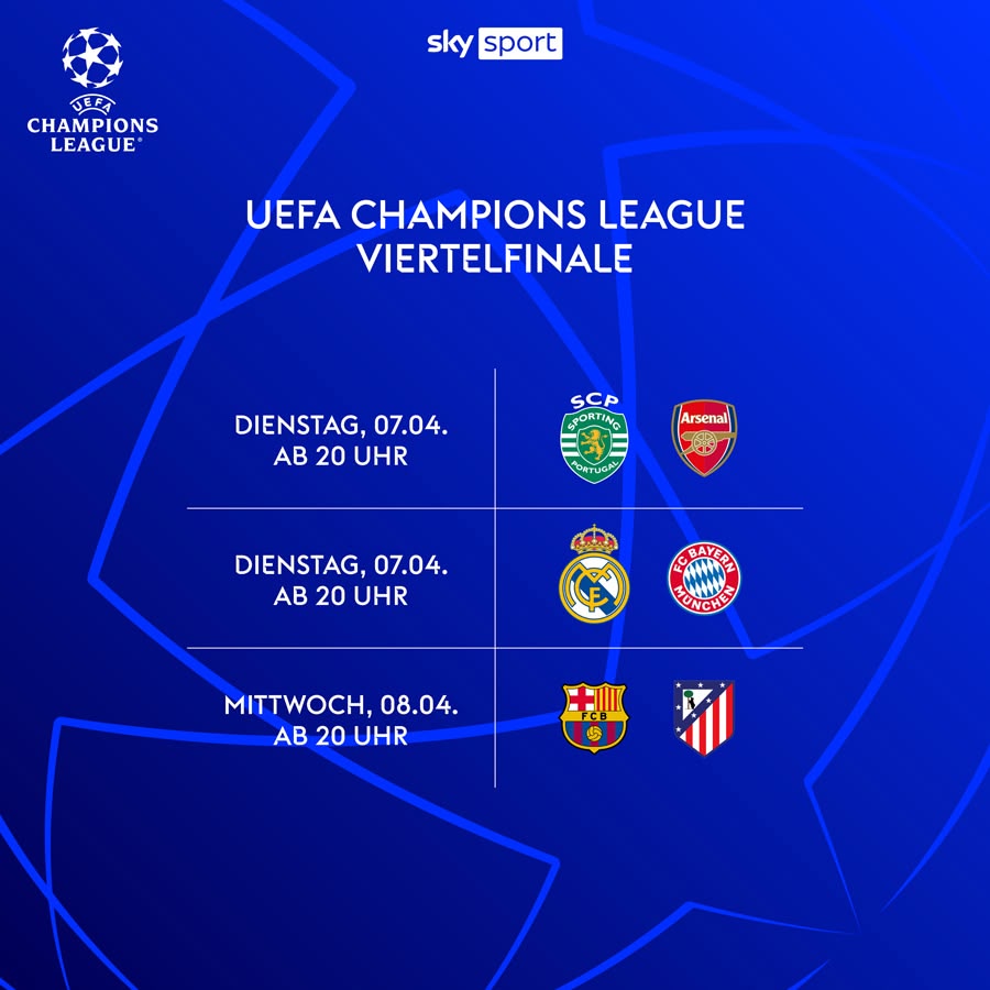 Das Achtelfinale der Königsklasse liest sich wie ein Who-is-who des Weltfußballs: Real Madrid trifft auf den FC Bayern, Sporting Lissabon auf den FC Arsenal, Paris Saint-Germain auf den FC Liverpool und der FC Barcelona spielt im rein spanischen Duell gegen Atlético Madrid. Die Hinspiele gehen am 7. und 8. April über die Bühne – die Rückspiele eine Woche später.